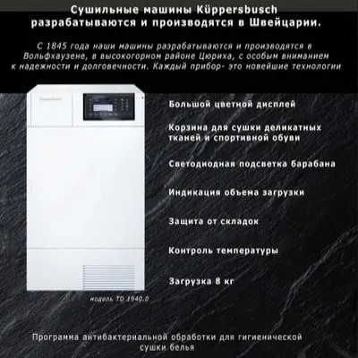 Сушильная машина Kuppersbusch T 40.0 G Solid GoldПрограммы/дополнительные программы: Автоматические программы для хлопка и немнущихся тканейОт степени сушки «под утюг» до «экстра-сухое»Специальные программы Сушка в корзине, Удаление пыльцы, Смешанное, и другие программы: Рубашки, Джинсы, Синтетика, Шерсть, Спортивная одежда, Пух/ подушки, Махровые полотенца, Пропитка, Шелк, Освежить (10-90 минут), Отсрочка старта (10-150 минут)Избранное Сохраняет до 6 Ваших любимых программДополнительные функции Антибактериальная обработка, Бережный уход +, Сушка +, Отсрочка старта, Экспресс8 кг белья будут полностью высушены за 96 минут («в шкаф»)Преимущества:Большой цветной дисплей 4,3’’Корзина для сушки деликатных тканей и спортивной обувиСушильная машина конденсационного типа с технологией Heat Pump и система самоочистки Autoclean для эффективного использования электроэнергии на протяжении всего срока службы машиныВысший уровень эффективности конденсацииПрограмма антибактериальной обработки для гигиенической сушки бельяПрограмма «Удаление пыльцы» позволяет очистить ткани от пыльцыПревосходная шумоизоляция, макс. 61 дБ(А)Светодиодная подсветка барабанаЗащита от складокЭлектронная система измерения остаточной влажности бельяИндикация хода программы и времени до окончания программы, отложенный запуск – до 7 днейРегулируемый по интенсивности акустический сигнал окончания программыУгол открывания люка – 180°, диаметр люка – 36/31 смВозможность перенавески люка (правая/левая)Защита от детейКонтроль температурыСпециальные программыСушка в корзинеВлажные вещи из шерсти желательно как можно меньше подвергать воздействию, так как они имеют тенденцию сморщиваться и садиться. Спортивная обувь может повредить барабан из-за своего веса. Использование корзины позволяет выполнять деликатную сушку без перемещения отдельных стойких к машинной стирке предметов: шерстяные изделия, спортивную обувь из синтетических материалов или искусственной кожи, шапки, велосипедные шлемы, мягкие игрушки, игрушки и пр.СмешанноеЭта программа оптимально подходит для сушки смешанной партии белья из хлопка и синтетикиДругие программыИспользуйте эти программы для оптимальной сушки различных видов текстиля, например сорочек, блузок, джинсов, шерсти и пр.Дополнительные программыАнтибактериальная обработкаПри выборе этой программы увеличивается время дополнительной сушки, что позволяет уничтожать большинство бактерийБережный уход плюсДля бережной сушки деликатных вещей. Температура сушки пониженаОтсрочка стартаС помощью данной программы запуск программы можно отложить на более позднее время в соответствии со своим привычным образом жизни (например, для использования льготного ночного тарифа на электроэнергию)Сушка +При выборе этой программы временно увеличивается степень сушки — на время работы выбранной программыВремяПри открытии программы с управлением по времени отображается минимальное время выполнения программыЭкспрессДля быстрой сушки небольшой партии или отдельных изделий из хлопка, синтетики или смешанной тканиХарактеристики:Конденсационная сушильная машина с технологией Heat PumpЗагрузка 1-8 кгСтационарная установка/установка в колоннуНавеска люка левая/праваяВозможность изменения навески люкаРазмеры прибора (Ш х В х Г): 595 х 850 х 640 ммСделано в Шве